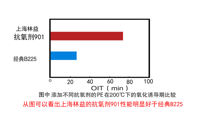 新型復合抗氧劑901經上海塑料研究所檢測結果顯示,在聚烯烴的熔融指數和氧化誘導期明顯優(yōu)于經典(汽巴)同類產品,且添加量為同類抗氧劑的80%。